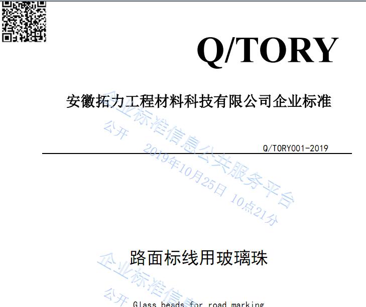 Q/TORY001-2019《路面標(biao)線用玻璃珠》企業標(biao)準發(fa)布