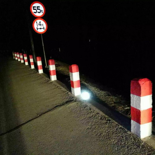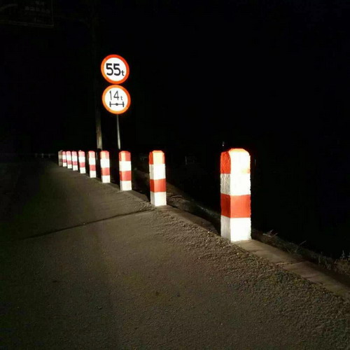 實體反光標記 entity reflective marking 用以給出道路凈空范(fan)圍內實(shi)體(ti)(ti)構筑物(wu)的輪廓,提醒(xing)駕駛人(ren)注意(yi)。可設在靠近道路凈空范(fan)圍的上跨橋(qiao)梁的橋(qiao)墩(dun)、中(zhong)央分割(ge)墩(dun)、收費島(dao)、實(shi)體(ti)(ti)安全(quan)島(dao)或導(dao)流島(dao)、燈座、標(biao)志基(ji)座及其(qi)他可能(neng)對行車(che)安全(quan)構成威(wei)脅(xie)的立(li)體(ti)(ti)實(shi)物(wu)表面上,在雨夜條件下具有反光功(gong)能(neng)的實(shi)體(ti)(ti)標(biao)記。