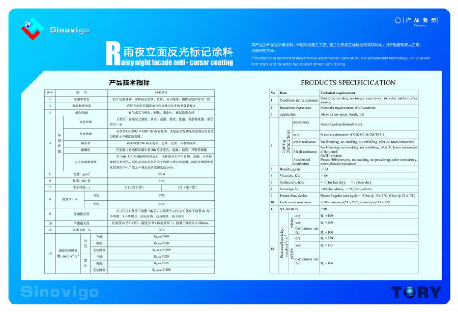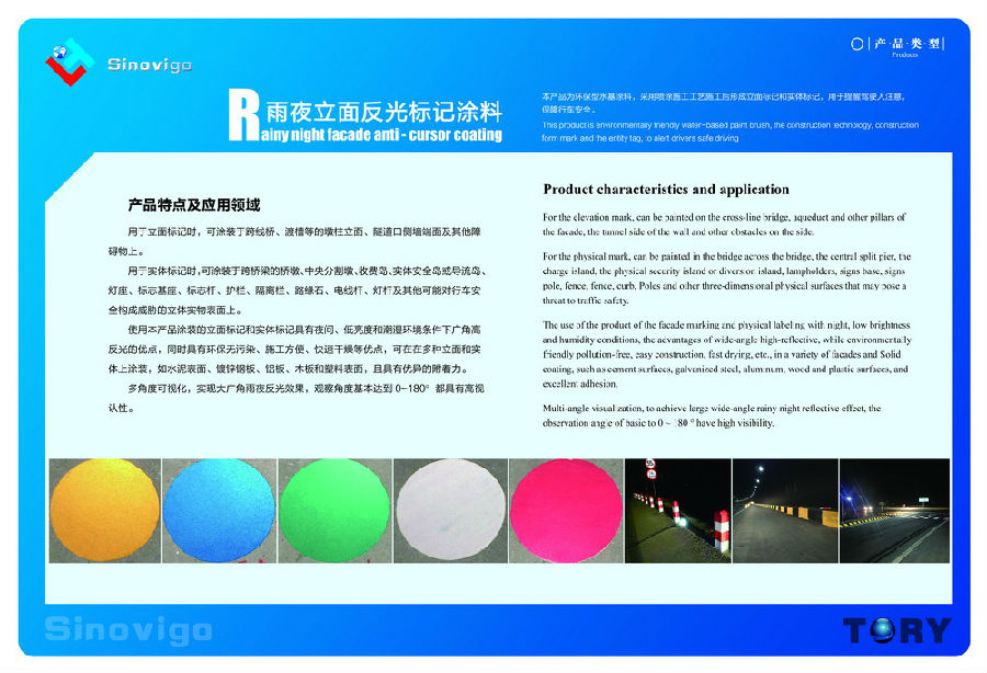sinovigo®彩色反光立面標記涂料 JT/T 1327—2020《立面反(fan)光標記涂料》 1、定(ding)義 立面反光標記 reflective marking 用以提醒駕(jia)駛人注意,在(zai)車行道(dao)(dao)或近旁有高出路(lu)面的(de)構造物,可(ke)設在(zai)靠近道(dao)(dao)路(lu)凈空范圍的(de)跨(kua)線橋、渡槽等的(de)墩柱立(li)面、隧(sui)道(dao)(dao)口側墻(qiang)端面及其他障礙物上,在(zai)雨(yu)夜條件(jian)下具(ju)有反光功(gong)能的(de)立(li)面標記(ji)。