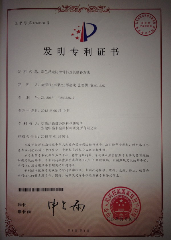 雨夜反光防滑骨(gu)料專(zhuan)利證書